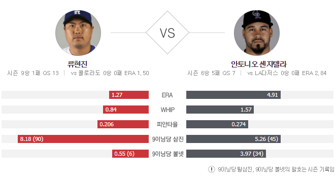 la다저스 류현진 역시 쿠어스필드에서 안좋은 기억이 있습니다. 통산 4경기 등판에서 1승3패 평균자책점 7.56(16⅔이닝 14자책)으로 약했고, 최근 3경기 연속 패를 기록했습니다. 특히 2017년 5월 12일 콜로라도 원정에서 4이닝 동안 안타 8개, 볼넷 6개, 몸에 맞는 공 1개를 내주며 무려 10실점(5자책)을 기록한 적이 있는데요. 메이저리그 진출 후 한 경기 최다 실점에 해당하는 기록입니다.
