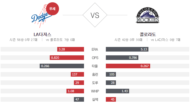 바로 어제 있었던 la다저스 콜로라도 7차전은 12-8로 다저스 승리였는데요. 타자 친화적인 구장인 만큼 양팀모두 많은 점수를 냈습니다. 양팀 선발이 더욱 긴장해야 하겠습니다.