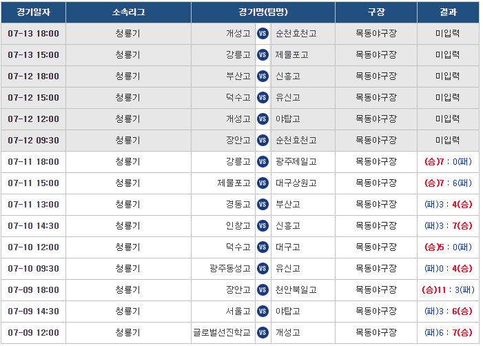 광주동성고는 10일 서울 목동야구장에서 열린 대회 16강전에서 5안타 빈공에 시달리며 유신고에 0대4로 완패했습니다. 그리고 7월 11일 펼쳐진 청룡기 전국고교야구대회 16강전 광주일고와 강릉고 경기에서 광주일고가 0-7, 7회 콜드게임 패했습니다.